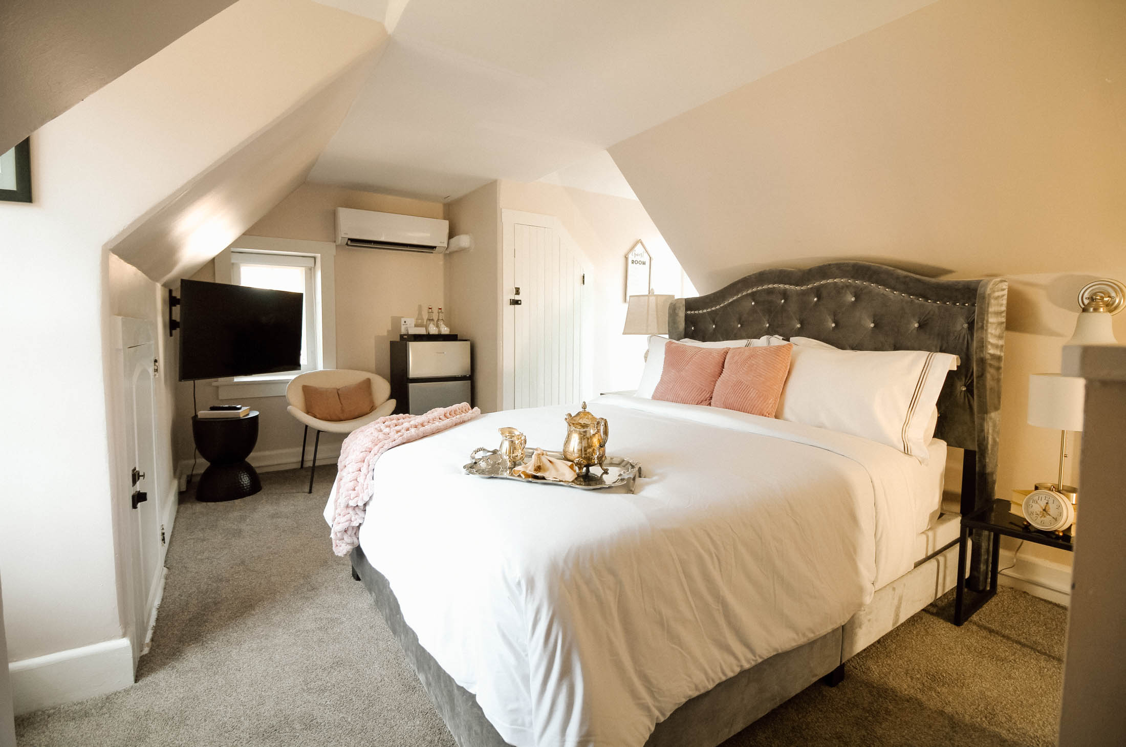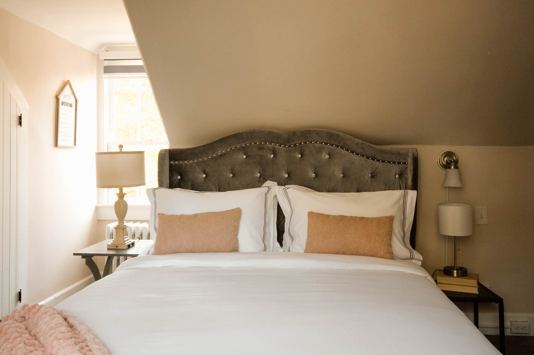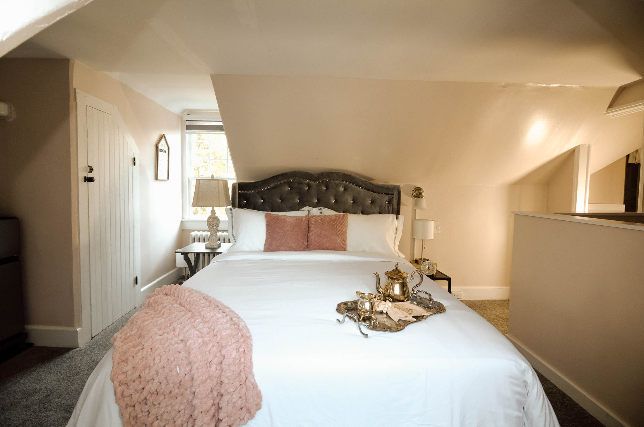 Welcome to the Chimney Hill Estate Inn – Room 8! This room is a beautiful room on the third floor of our 5,500-square-foot Colonial house. It is completely private with a queen bed and a walk-in shower. All common areas are available for our guests to hang out or work. Book your stay today!