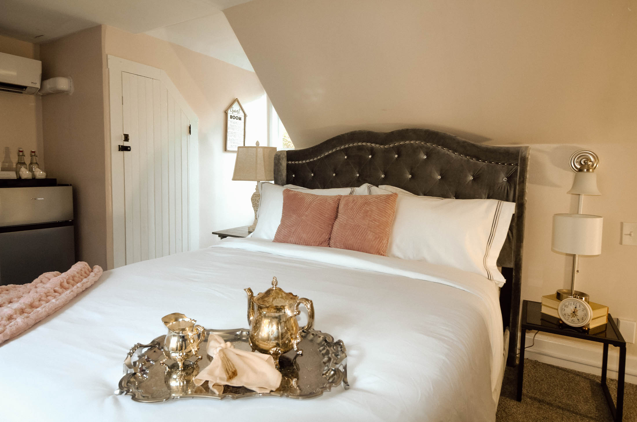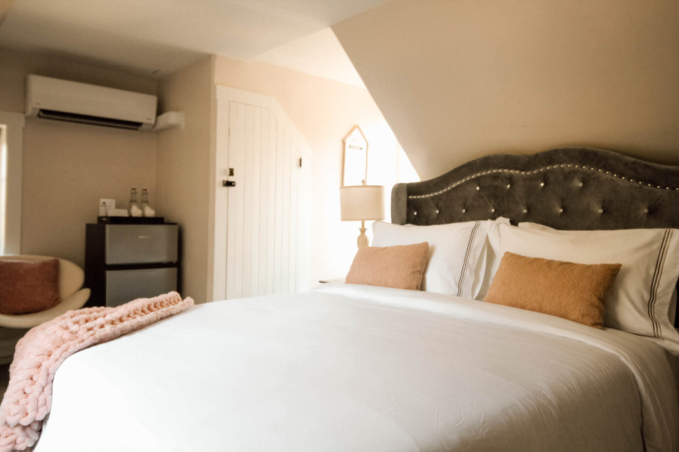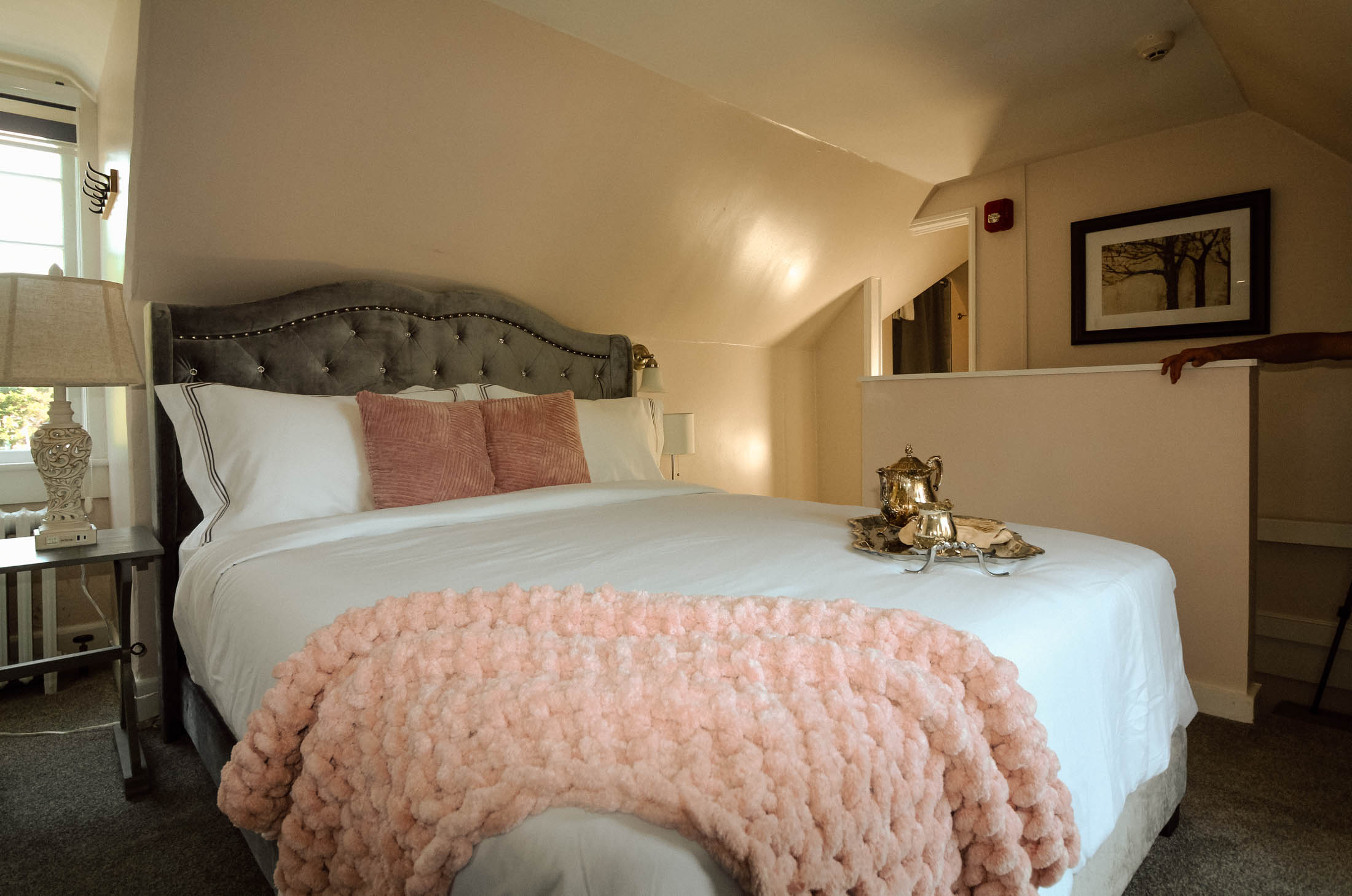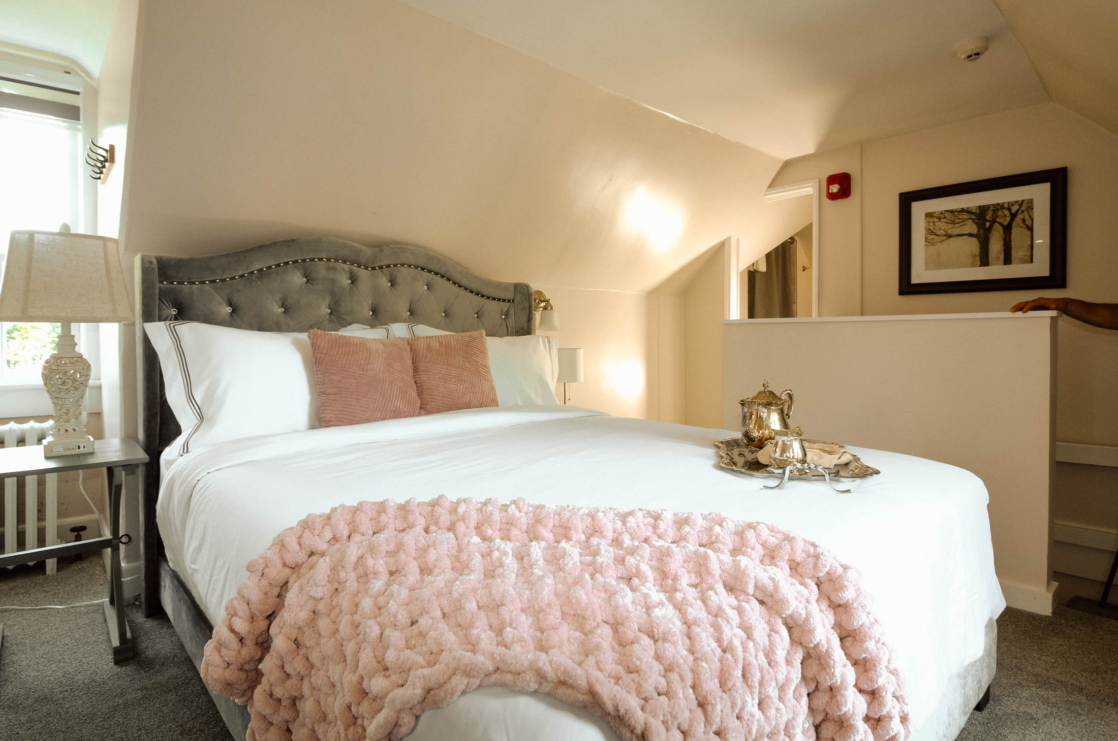Welcome to the Chimney Hill Estate Inn – Room 8! This room is a beautiful room on the third floor of our 5,500-square-foot Colonial house. It is completely private with a queen bed and a walk-in shower. All common areas are available for our guests to hang out or work. Book your stay today!